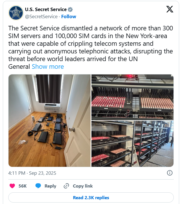نیویارک، 23 ستمبر – امریکا کی سیکریٹ سروس نے کہا کہ اس نے ایک لاکھ سے زیادہ سم کارڈز کا ایسا نیٹ ورک تباہ کیا ہے جو اقوام متحدہ کے جنرل اسمبلی اجلاس سے پہلے نیو یارک کے ٹیلی کمیونیکیشن نیٹ ورک کو خراب کر سکتا تھا۔