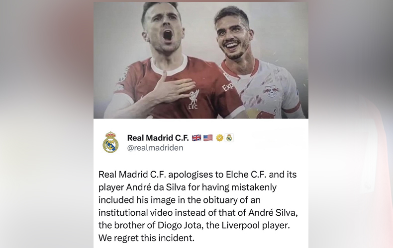 ریئل میڈرڈ نے سوشل میڈیا پر ایک بیان جاری کیا: “ریئل میڈرڈ سی ایف، ایلتچے سی ایف اور ان کے کھلاڑی آندرے داسِلوا سے معذرت خواہ ہے کہ ایک ادارہ جاتی تعزیتی ویڈیو میں غلطی سے ان کی تصویر کو لیورپول کے کھلاڑی ڈیوگو جوٹا کے بھائی آندرے سِلوا کی بجائے شامل کر لیا گیا۔”