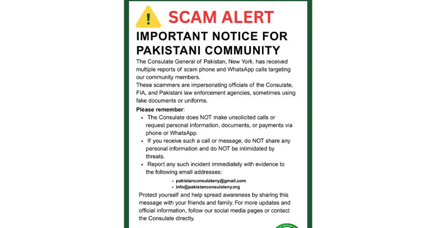 نیویارک میں پاکستانی قونصل خانے نے ایک عوامی انتباہ جاری کرتے ہوئے بتایا ہے کہ پاکستانی کمیونٹی کے افراد کو حال ہی میں نامعلوم یا اسپیمنگ کے ذریعے اسپوف کیے گئے نمبروں سے فون اور وہاٹس ایپ کالز موصول ہو رہی ہیں۔