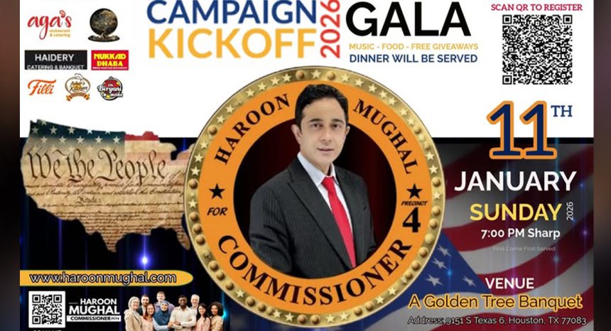 ہیوسٹن: ہیوسٹن، ٹیکساس میں کمشنر کے امیدوار ہارون مغل کی انتخابی مہم 2026 کے باضابطہ آغاز کے سلسلے میں ایک شاندار گالا تقریب منعقد کرنے کا اعلان کیا گیا ہے۔ جاری کردہ تشہیری پوسٹر کے مطابق یہ تقریب 11 جنوری، اتوار کو شام 7 بجے منعقد ہوگی۔