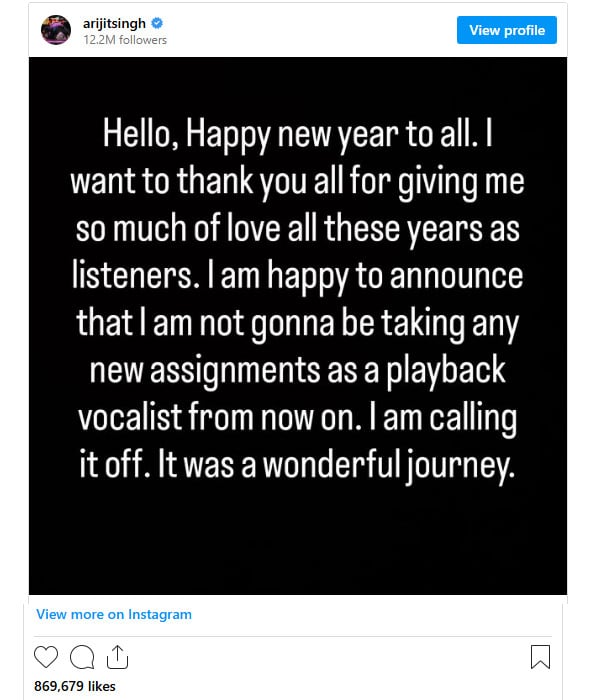 انسٹاگرام پر سامنے آنے والے ایک بیان میں اریجیت سنگھ نے اپنے مداحوں کا شکریہ ادا کرتے ہوئے کہا کہ وہ بطور پلے بیک سنگر اپنا سفر ختم کر رہے ہیں اور اب فلموں کے لیے نئے گانے ریکارڈ نہیں کرائیں گے۔