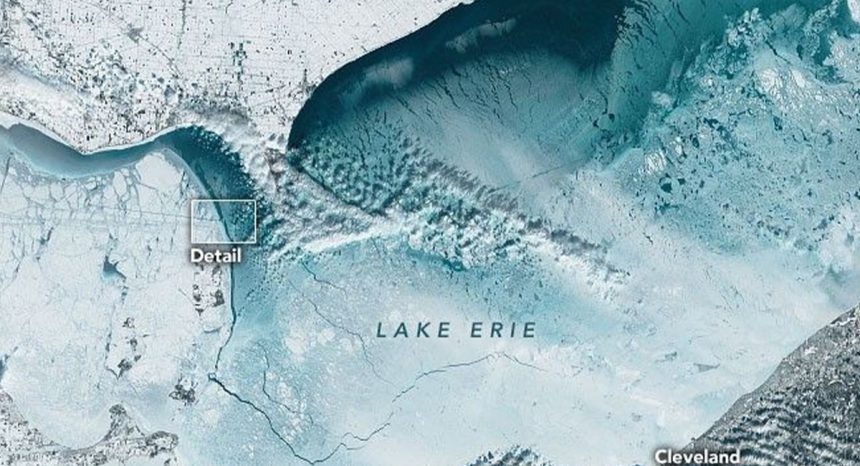 نیویارک (ویب ڈیسک): گریٹ لیکس کے اوپر صاف آسمان اور حالیہ شدید سرد لہر کے باعث سیٹلائٹ تصاویر میں جھیل ایری (Lake Erie) کا منظر حیران کن حد تک تبدیل ہو چکا ہے۔ یہ جھیل اب مکمل طور پر منجمد ہونے کے بے حد قریب پہنچ چکی ہے۔