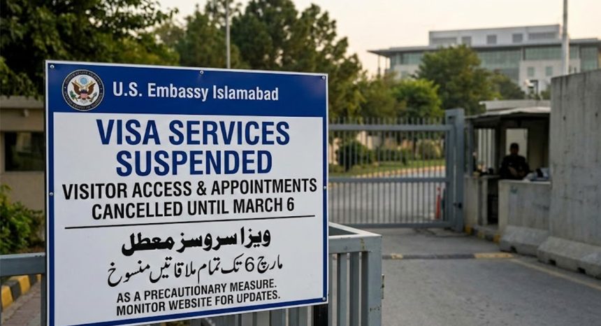 اسلام آباد(ویب ڈیسک): پاکستان میں امریکی مشن (سفارت خانہ اسلام آباد اور لاہور و کراچی کے قونصل خانوں) نے ملک کی موجودہ سیکورٹی صورتحال کے پیشِ نظر تمام ویزا اپائنٹمنٹس اور دیگر قونصلر خدمات 6 مارچ تک معطل کرنے کا اعلان کر دیا ہے۔